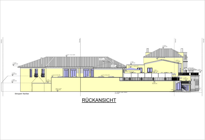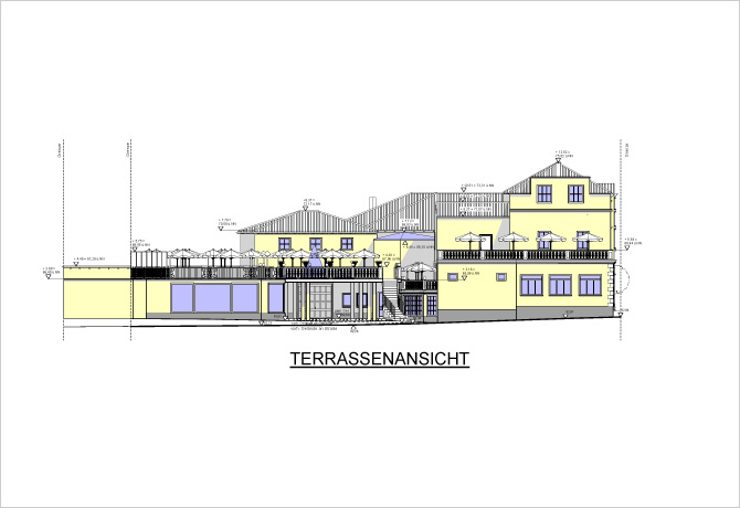 Geplanter Neubau einer Bäckerei mit Gastronomie und Ladenlokal in Sankt Augustin. Auf dem Grundstück befinden sich ein Restaurant in mediterraner Architektur sowie eine Autowerkstatt mit Showroom. Der Neubau sollte sich in die vorhandene Architektur einfügen und eine maximale Ausnutzung des Grundstücks erzielen.